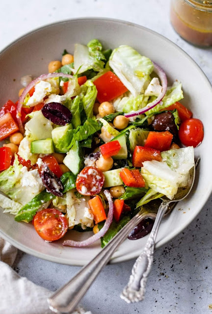 1.Place romaine in a large bowl and layer the veggies, chickepeas, olives and feta cheese over the top.